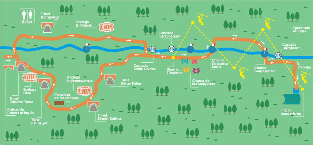 Charco de aguas cristalinas de la Quebrada Morales, con una especie de jacuzzi natural en la parte alta, en donde el sabio José Celestino Mutis, solía descansar. Mutis administró las minas durante 10 años por orden del Rey Carlos III, antes de que se le encomendara la dirección de la Expedición Botánica.