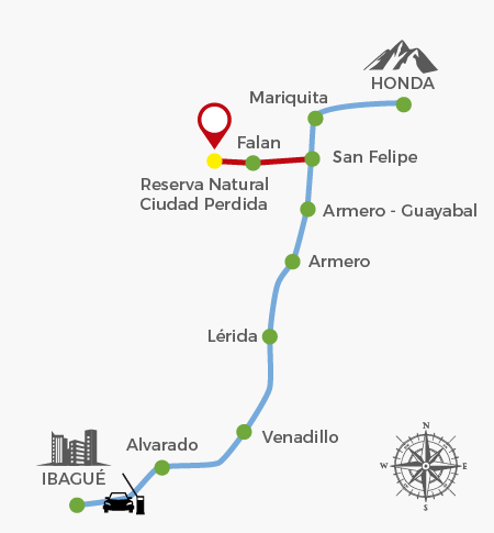 En le municipio de Falan se encuentra ubicado a 115 Km de la cuidad de Ibagué. En la vía Mariquita – Armero Guayabal, encontrará el cruce de San Felipe, desviación que lo llevará por cerca de 10 km al parque principal frente a la Iglesia de Santa Ana y por la calle Morales a 5 minutos de viaje llegará a la reserva.